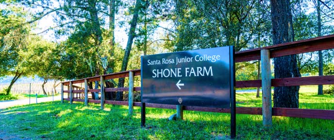 Shone Farm includes 120 acres of forest, 100 acres of pasture, 90 acres of vineyard, 12 acres for crop production, 4 acres of olive and apple trees, and 39 acres of buildings and improvements. Altogether, Shone farm is one of the largest agriculture sites in the California Community Colleges system.